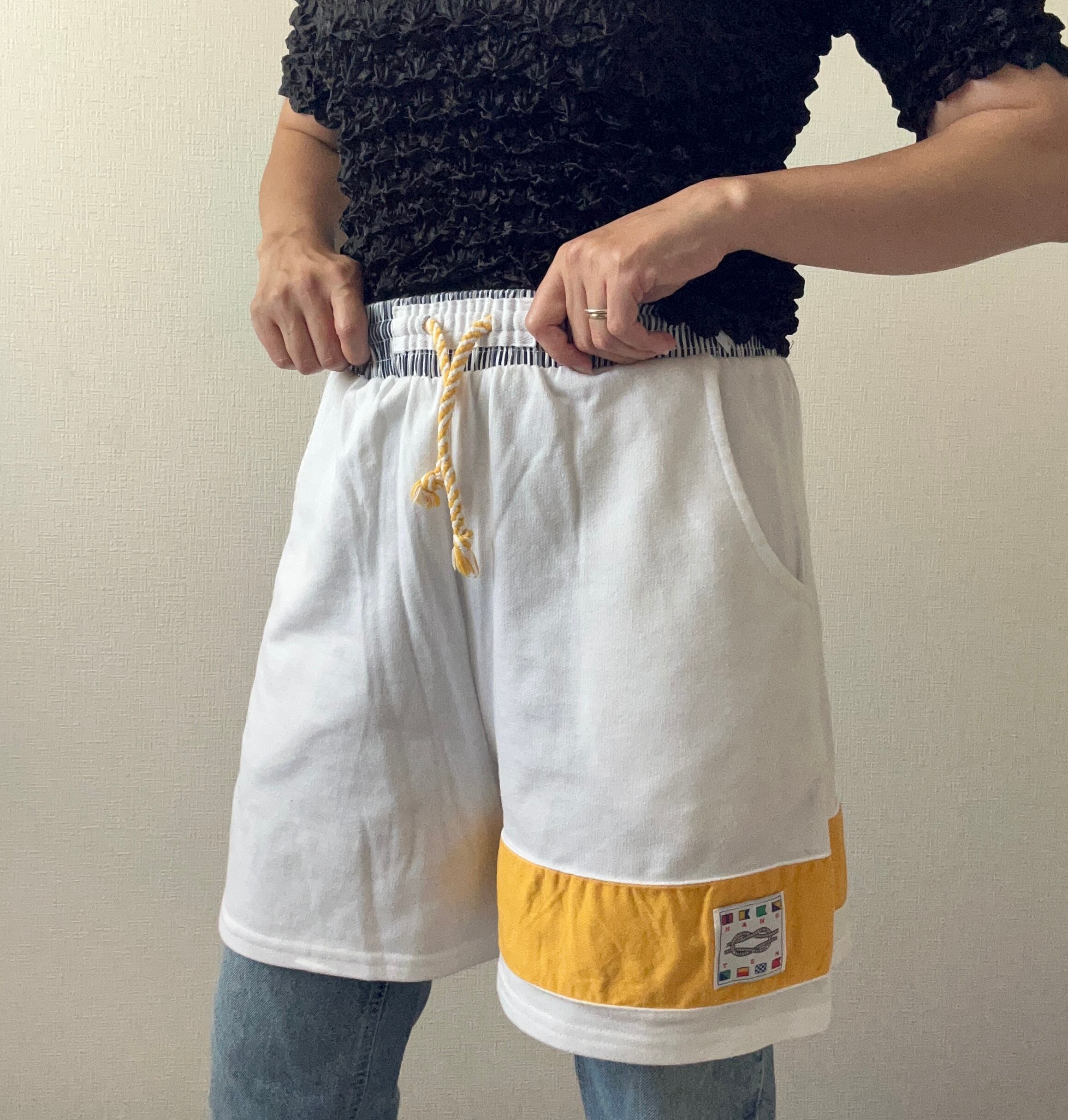 ウエストとヒップポケットのストライプ柄や、イエローがポイントで入っていてアクセントに。