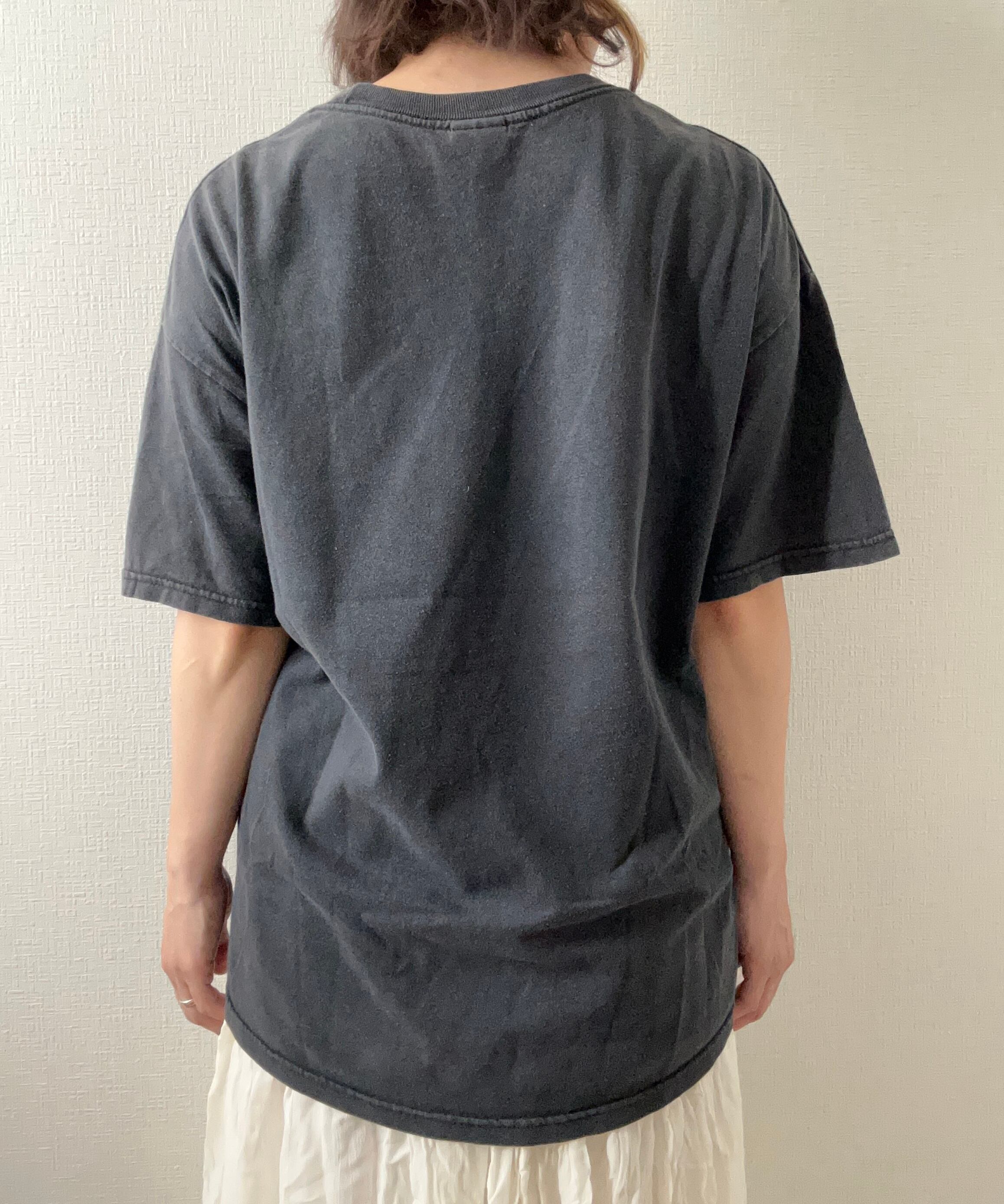 いい感じに色落ちしたブラックのボディに、プリントのピンクが効いてます。キノコの表情も◎