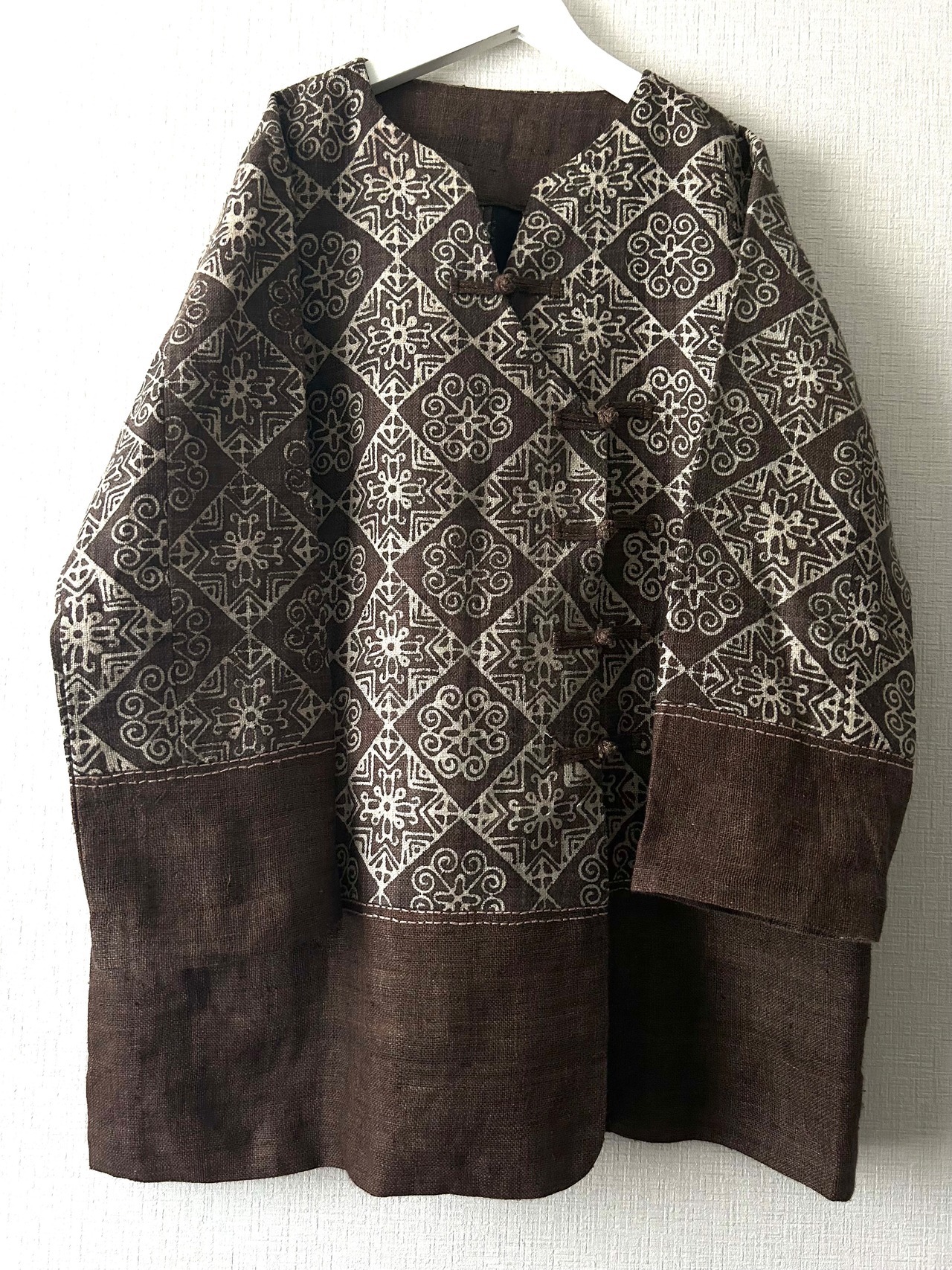 この色と柄、よくよく見ると首元がV、チャイナボタン、袖と裾の切り替えには薄いピンクのステッチ…