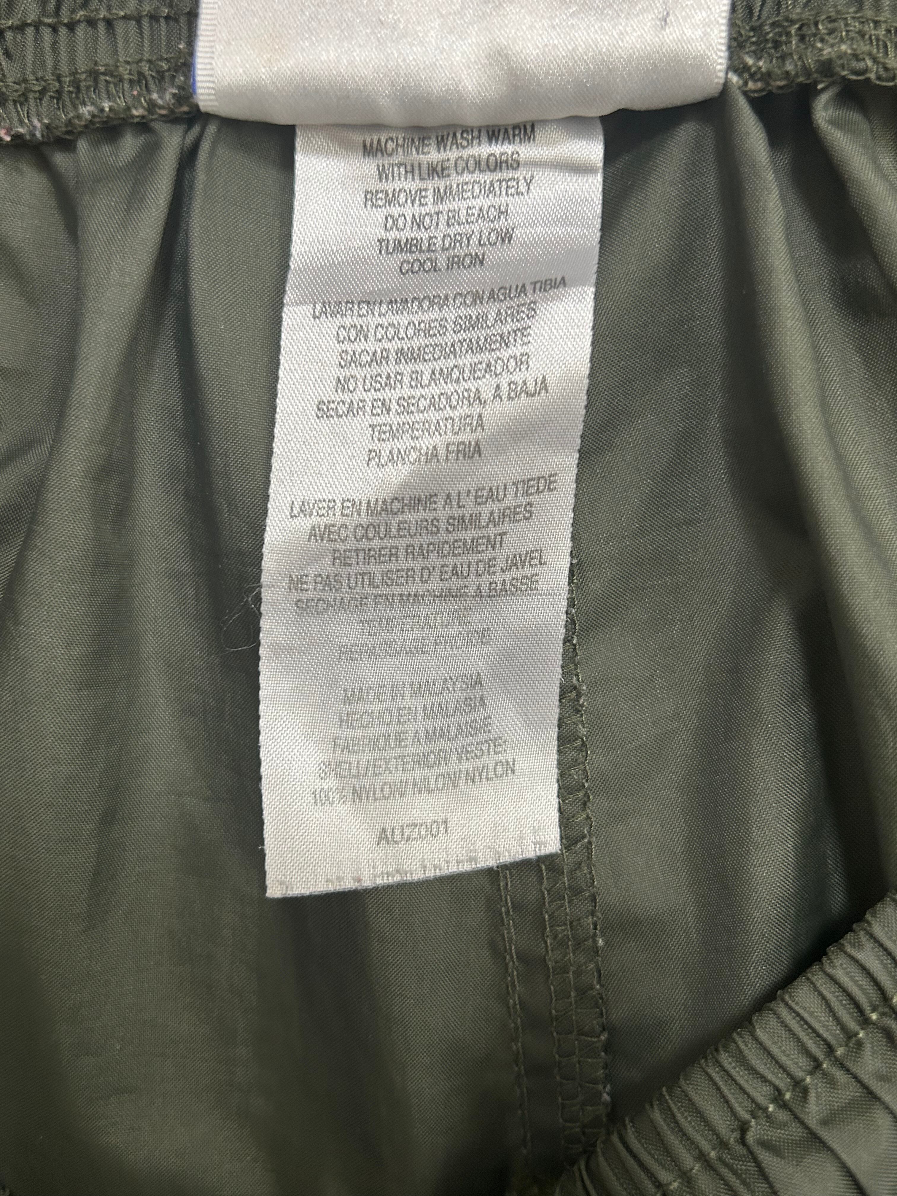 ナイロン特有のシャカシャカとした生地で、オリーブカラーのボディに薄い黄色の3本ラインが入ったデザイン。