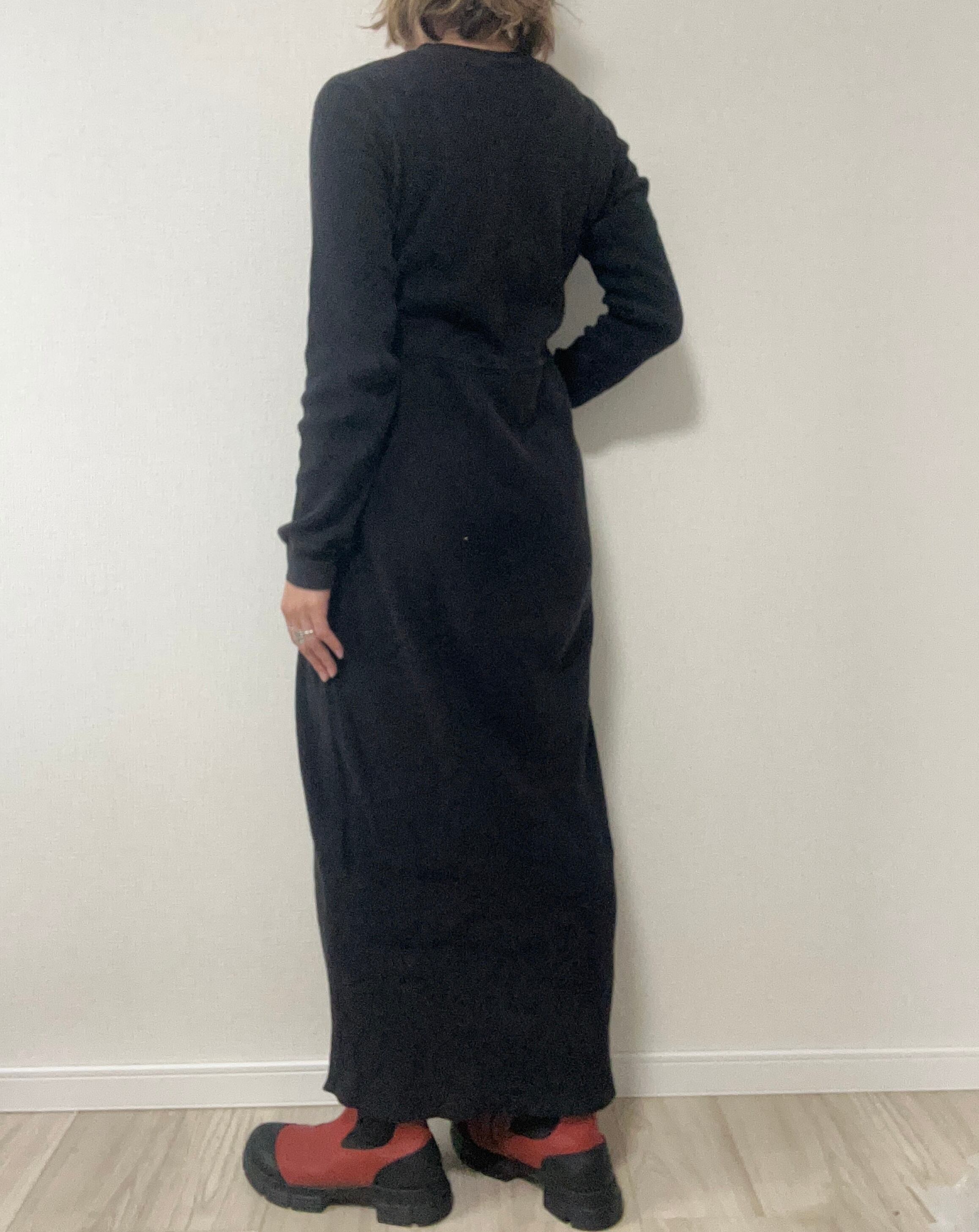 フロントはボタン開閉で、フルオープンできます。ボタンもシェルボタンでポイントになります。ウエストの切り替えが腰位置を高く見せます。