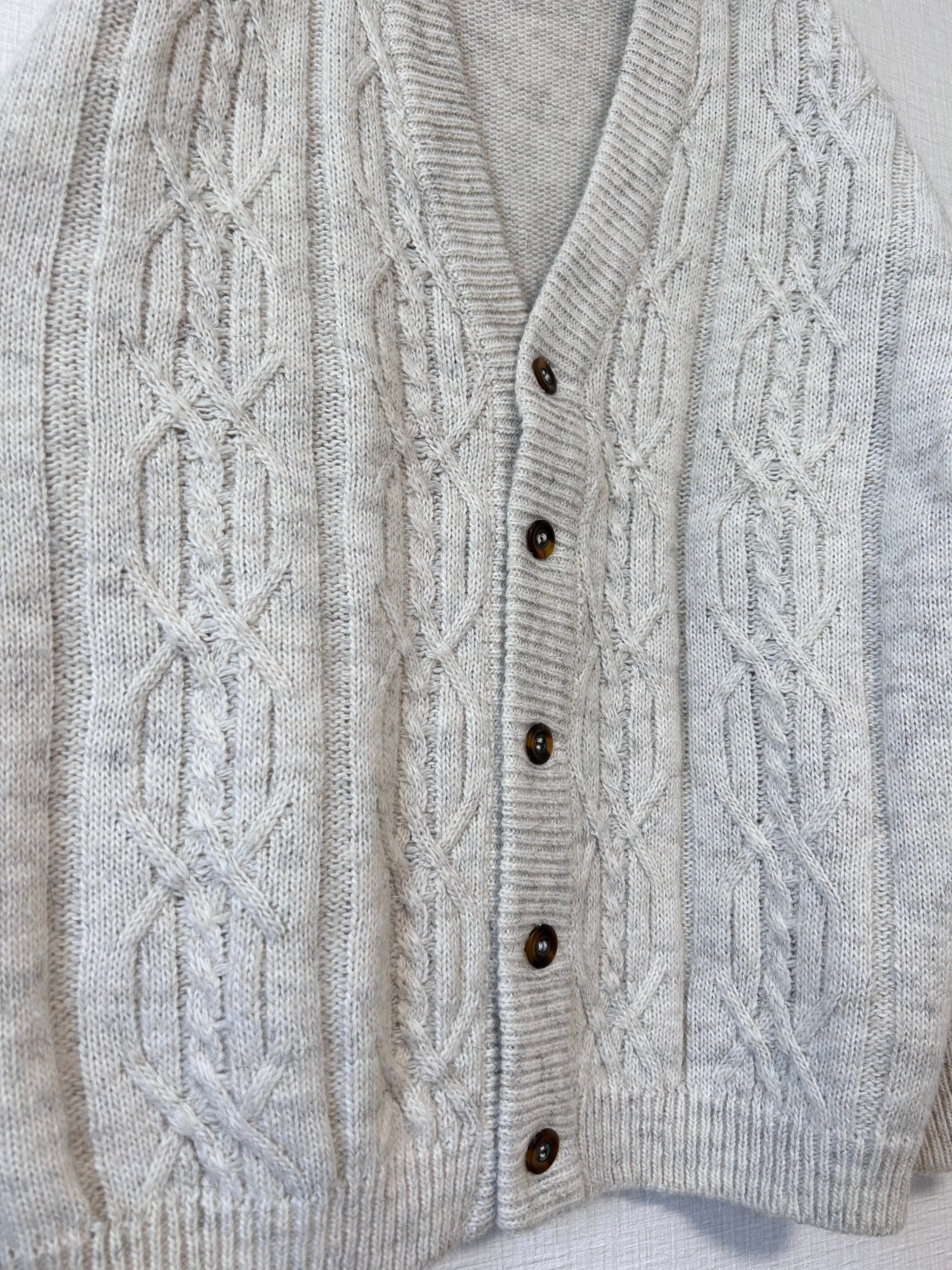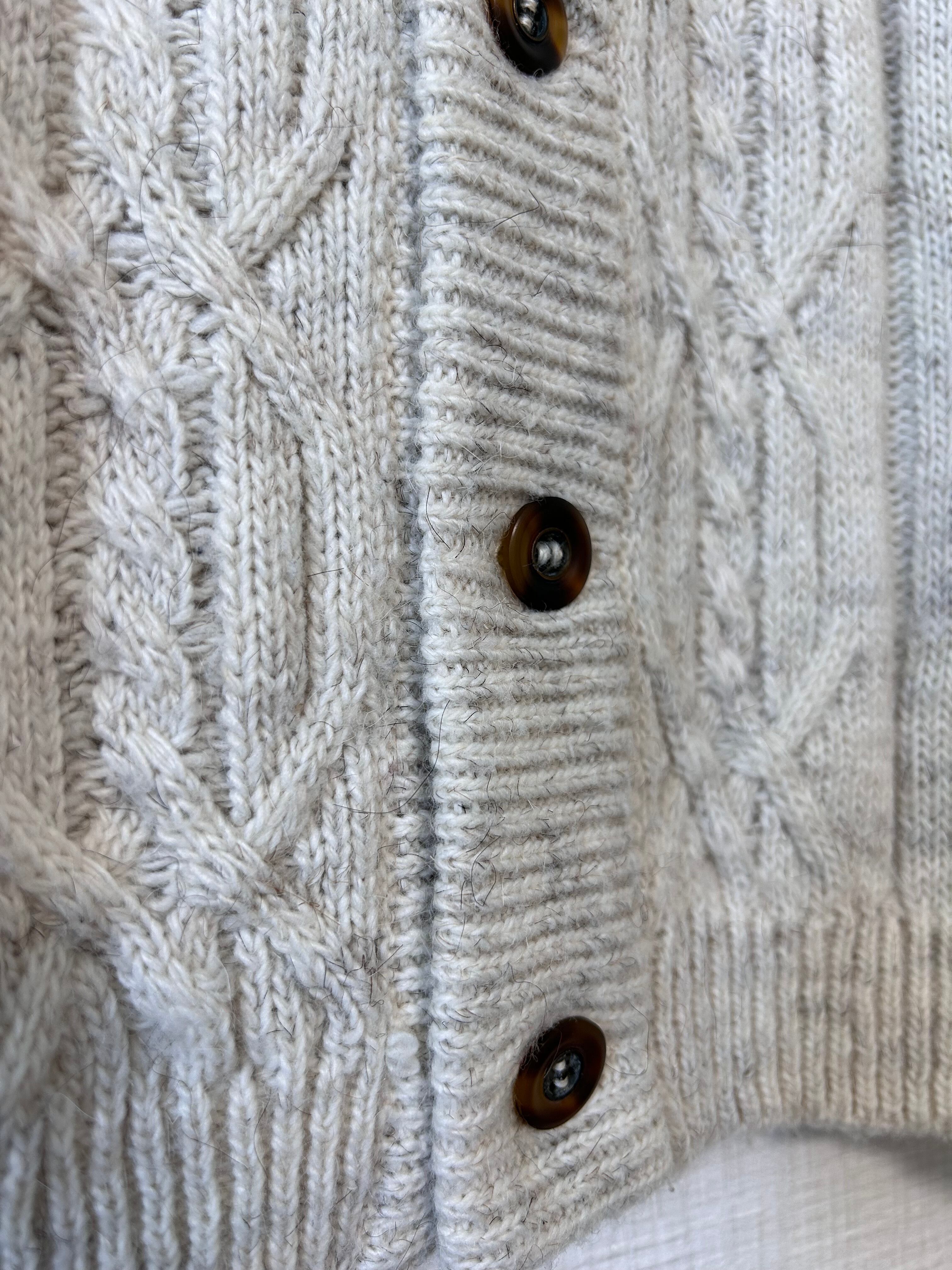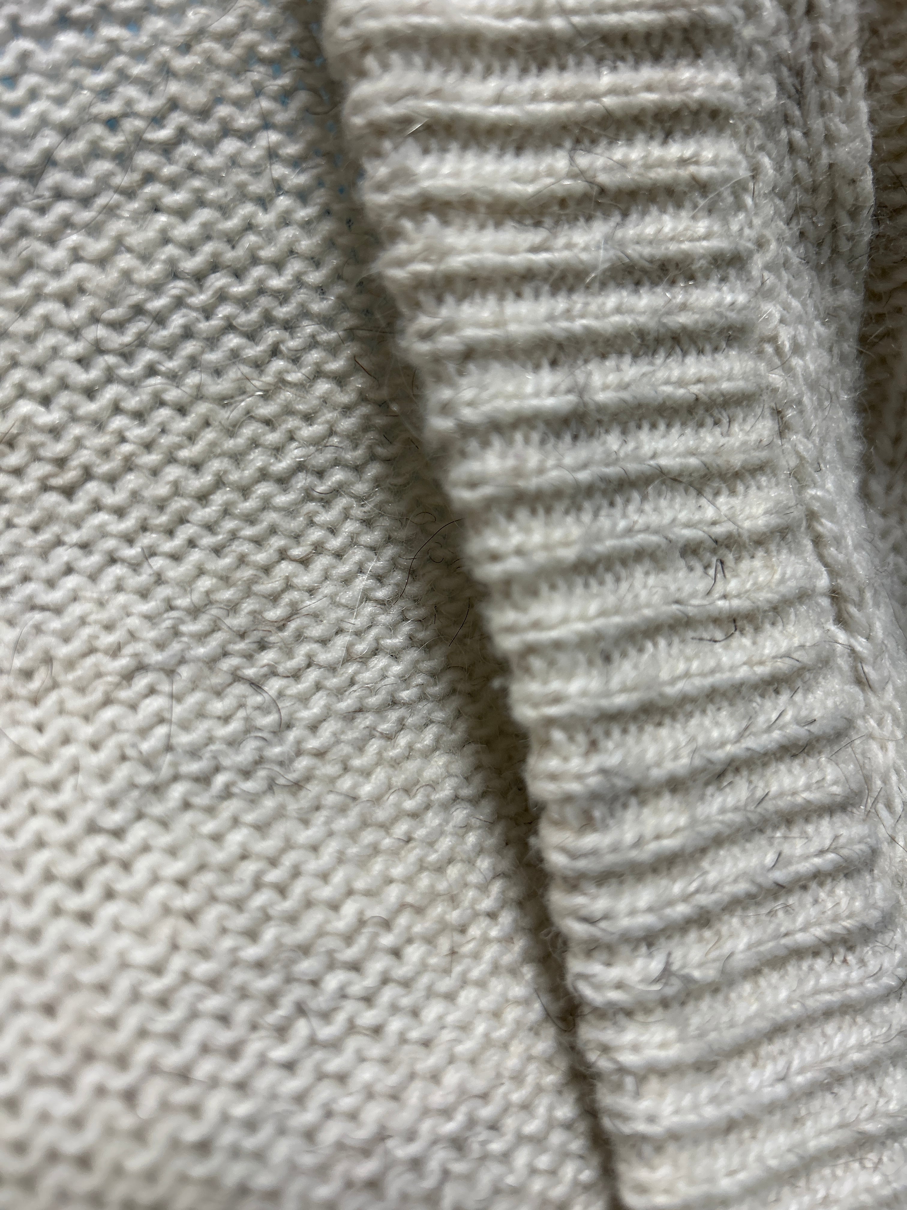 白系の糸にランダムに黒や茶色の毛が混ざっており、ライトグレーやアイボリーのようにも見えます。