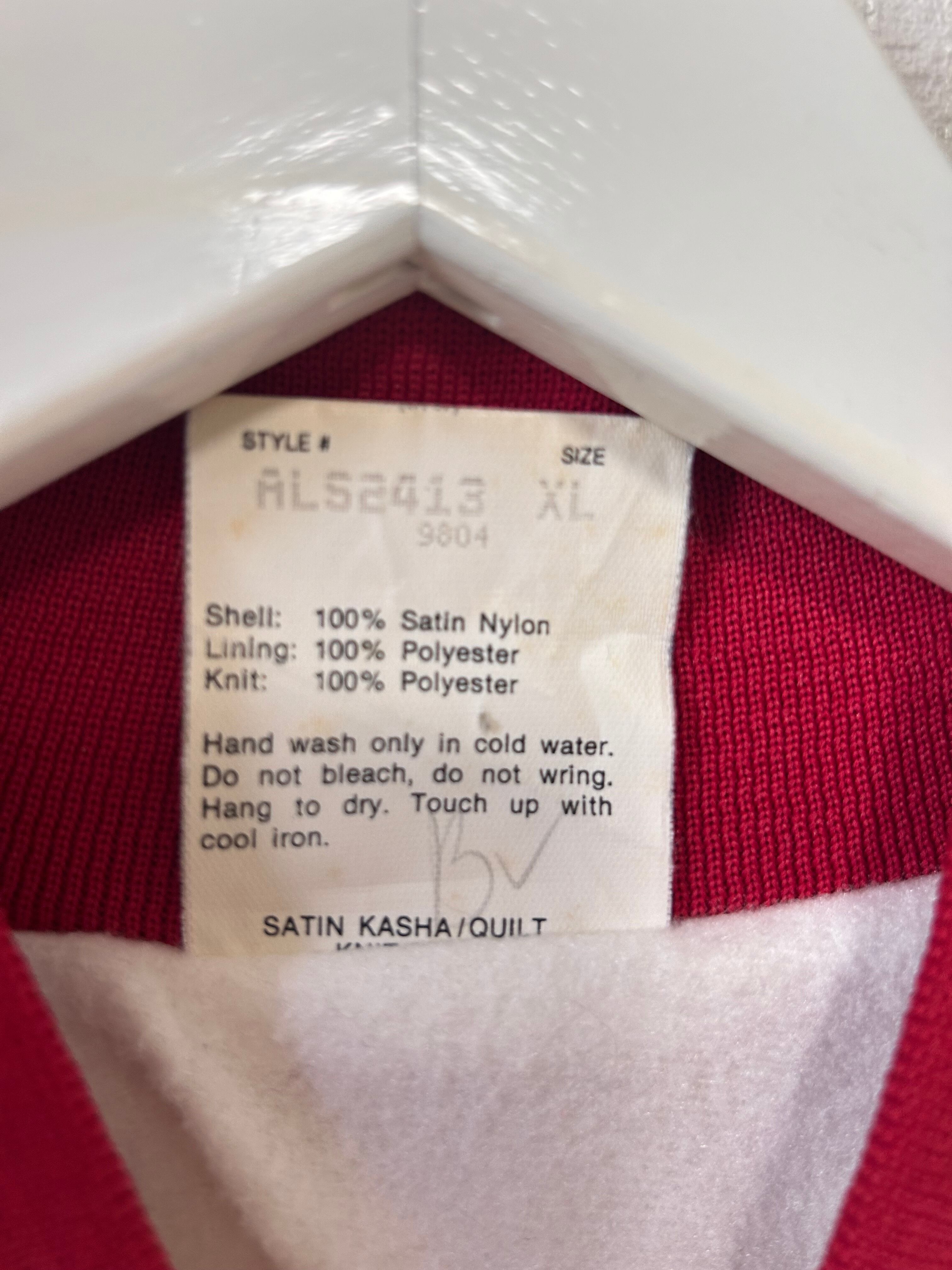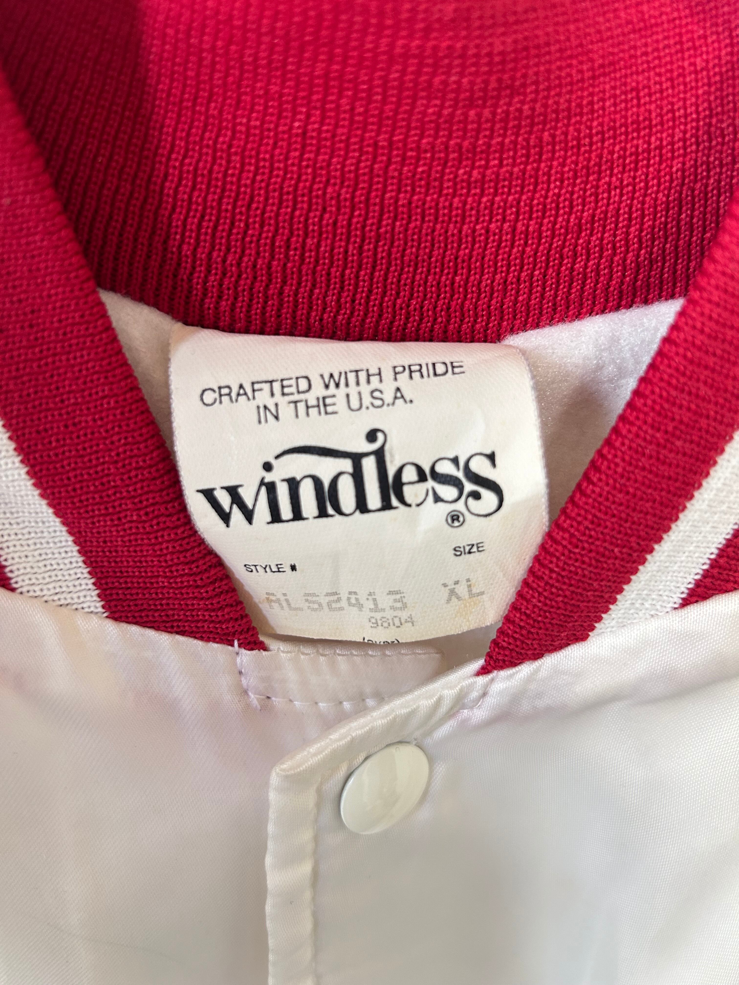 白いサテンナイロンのツルッとした素材に、赤い刺繍とニットのリブが印象的なアウター。